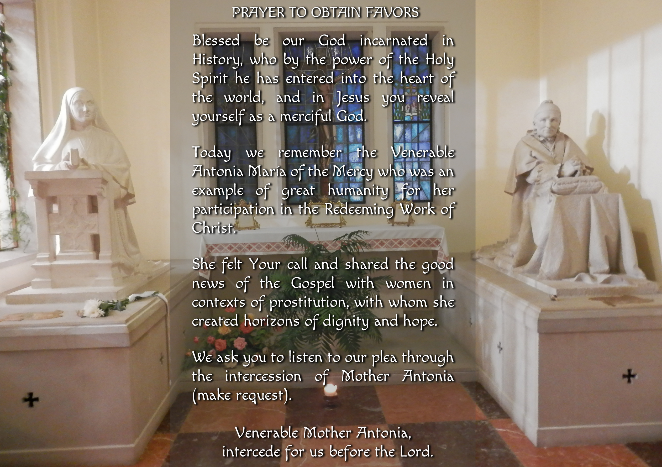 Present to the Father what concerns you at this moment and ask that through the intercession of the Vble. Antonia grant you this grace