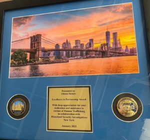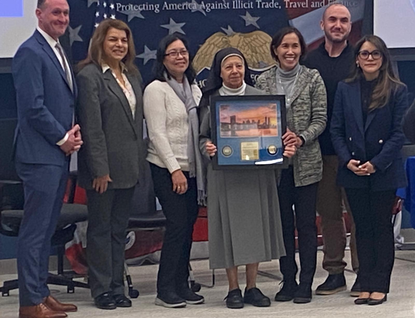 Presentada a las Hnas. Oblatas                                                                                          Premio a la Excelencia y colaboración                                                                                Con profundo aprecio por su dedicación y asistencia a las víctimas  de trata de Seres Humanos en colaboración con  Homeland Security Investigación New York